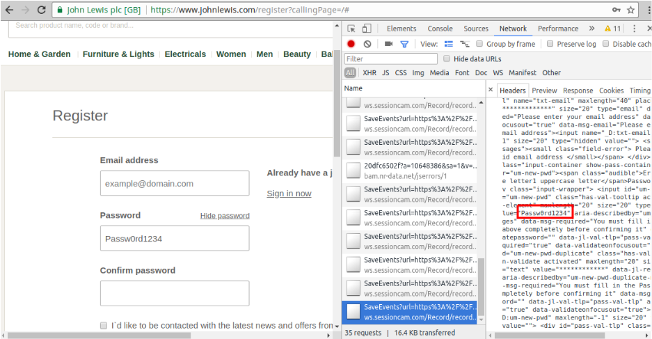 Fig 3. Password leaks to Sessioncam on johnlewis.com.