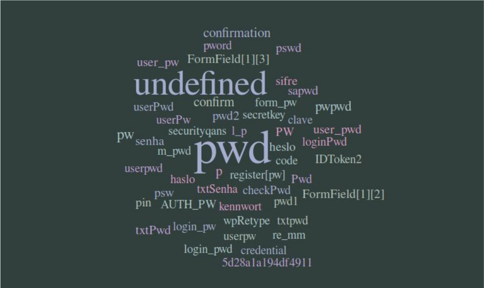 [9] Wordcloud of 50 most common password field name/id attributes that don’t include the substring “pass”, and will thus not be excluded by Mixpanel. This data was collected from a crawl of ~50K sites (~300K page visits). “Undefined” stands for password fields without any name or id attributes. Many of these words are translations of the word “password”, such as: “senha”(Portugese), “sifre” (Turkish), or “kennwort” (German).