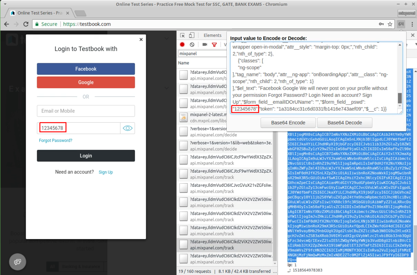 One of the password leaks occurs on testbook.com’s [2] login form when a user makes use of the “Show Password” feature, which causes the user’s password to be displayed in cleartext. Once the user takes a further action, such as editing the password or hiding it again, the password will be collected by Mixpanel. The collection happens regardless of whether the user ultimately submits the login form.